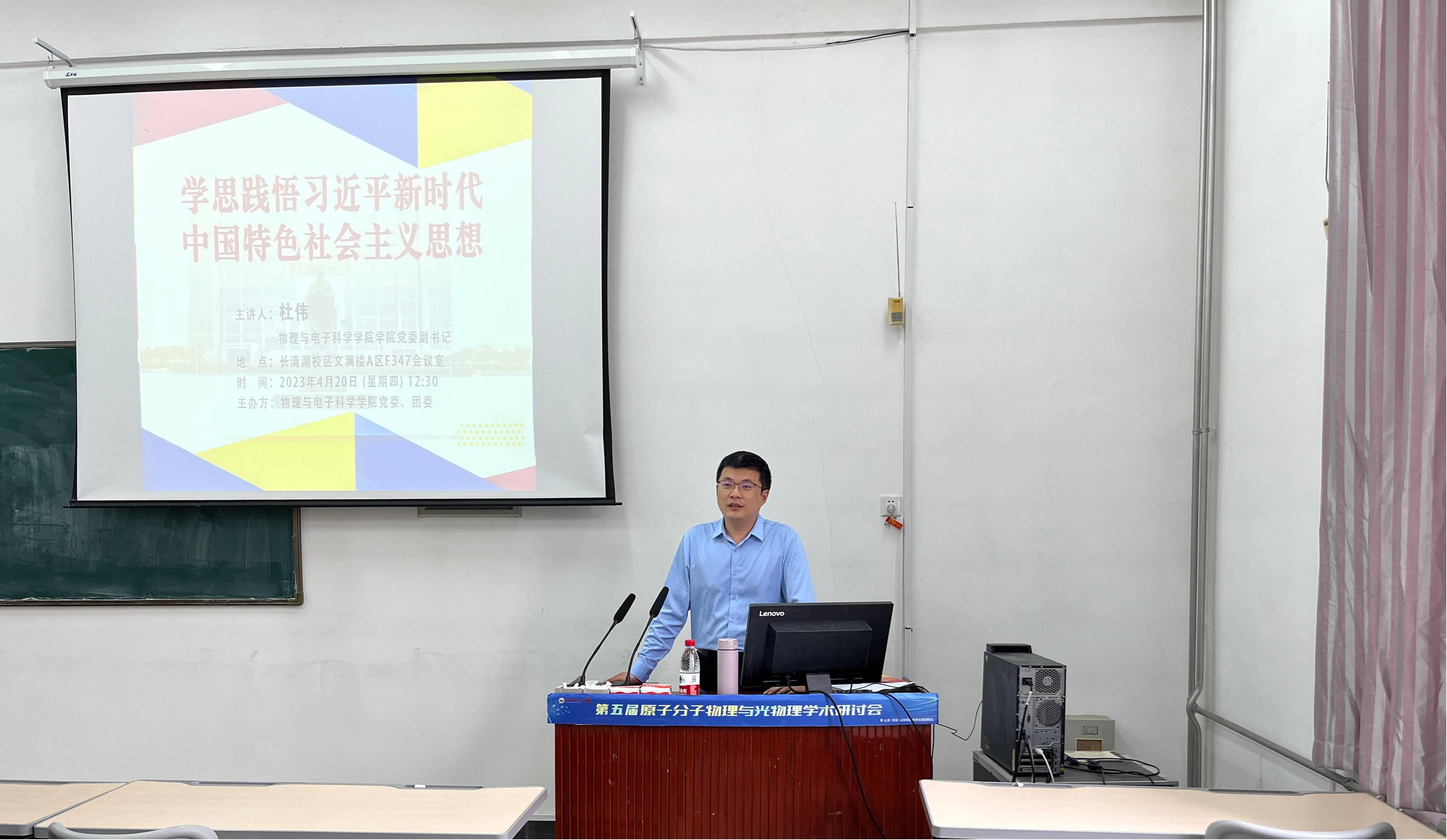 4月19日中午,物理与电子科学学院于文澜楼A区F345举办“学思践悟习近平新时代中国特色社会主义思想”主题党课,本次讲座由学院党委副书记杜伟担任主讲人,学院百余名同学参与本次会议。